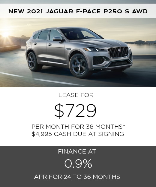 *New 2021 Jaguar F-PACE P250 S AWD with 36-month lease, $4,995 due at signing includes $3,371 down, $0 security deposit, $895 acquisition fee and first month's payment; excludes retailer fees, taxes, title and registration fees, processing fee and any emission testing charge. Actual rates and payments of closed-end lease may vary. Supplies are limited. For well-qualified lessees as determined by approved lender. All amounts shown are estimates; retailer sets actual amounts. Lessee responsible for insurance, maintenance, excess wear and excess mileage over 30,000 miles at $0.30/mile. Based on MSRP of $59,090 (excludes destination and handling). Total of lease payments $26,244. Residency restrictions apply. Lessee has option to purchase vehicle at lease end at price negotiated with retailer and approved lender at signing. Termination fee may apply. Customer must take new vehicle delivery from retailer stock by 9/30/2021. Jaguar or approved lender may rescind or amend this offer without notice. Model pictured may vary from offer. See your participating Jaguar Retailer for complete details, or call 1.800.4.JAGUAR / 1.800.452.4827. © 2021 Jaguar Land Rover North America, LLC.